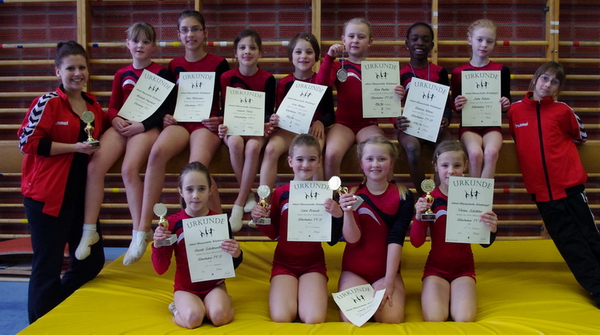 Die Turnerinnen Der ETV starteten am Boden. Ob es nun die Aufregung war oder totale Unkonzentriertheit, 50% aller Bodenübungen unsere Kinder waren eine totale Katastrophe. Handstandabrollen ging bei mehreren Turnerinnen schief, Felgrollen waren nicht zu erkennen und sogar ganze Übungsteile wurden vergessen. Kira turnte in ihrer Übung die Felgrolle nicht mit, dafür turnte Loni sie dann kurze Zeit später einfach zwei Mal. Steffi Bulitz und Iris Eichstaedt, die die Kinder in der Halle begleiteten, waren nach dem ersten Gerät sicher, dass das heute kein gutes Ende nehmen kann. |