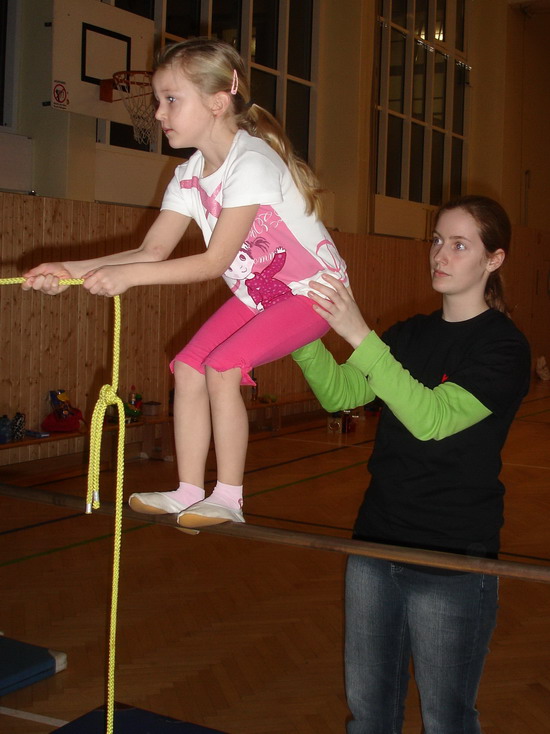 Nach dem Aufwärmen helfen alle Kinder beim Aufbau mit. In 2-3 Riegen turnen die Kinder unter Anleitung und Hilfestellung von Steffi mit Gilda,